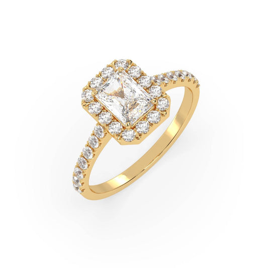 Pierścionek Zaręczynowy Halo z Diamentem o Szlifie Radiant i Obrączką Pavé - Żółte złoto 18k