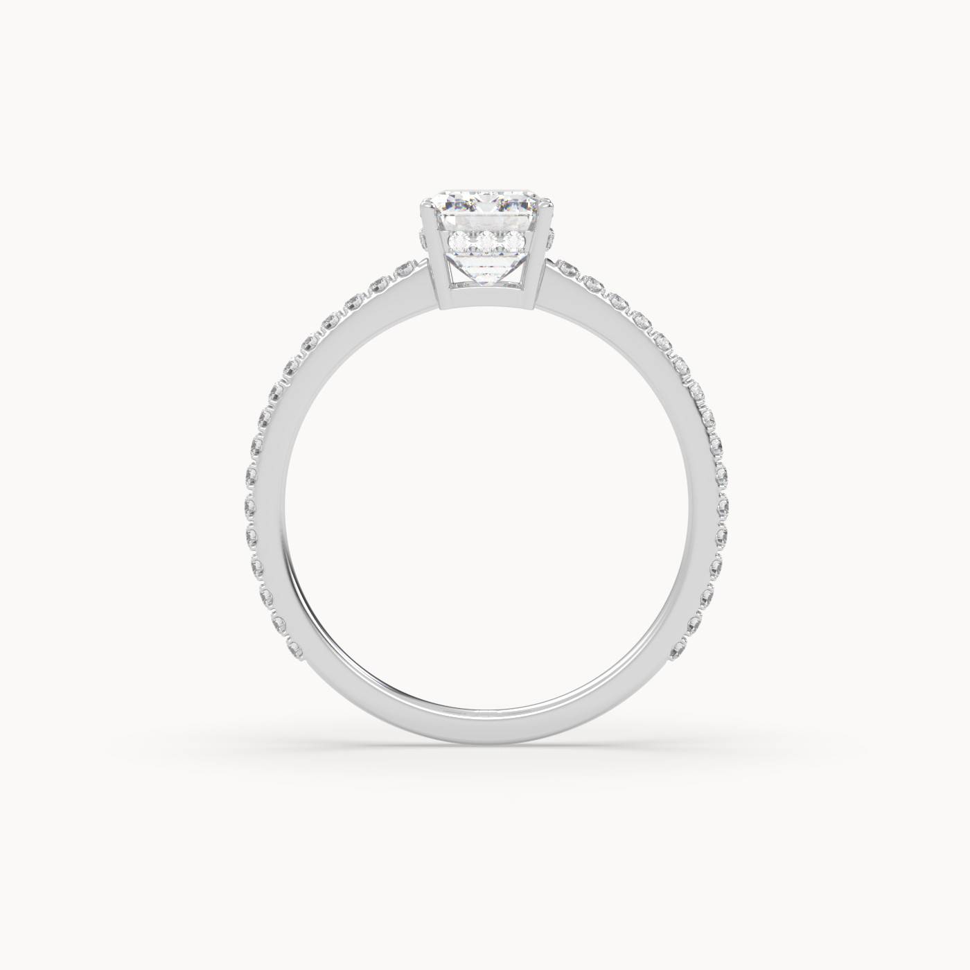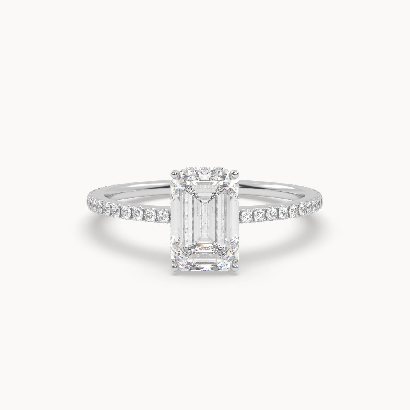 Ten elegancki pierścionek zaręczynowy wykonany z 18-karatowego białego złota prezentuje diament laboratoryjny o szlifie szmaragdowym, który jest centralnie umieszczony i dodatkowo podkreślony przez underhalo oraz oszałamiające boczne diamenty pavé. Białe złoto z jego chłodnym i nowoczesnym wyglądem idealnie komplementuje każdy z diamentów, zapewniając wyrafinowaną i spójną estetykę. Underhalo dodaje nie tylko blasku, ale także subtelnej złożoności, co czyni ten pierścionek wyjątkowym wyborem dla każdego, kto poszukuje zaręczynowego pierścionka o unikalnym charakterze.