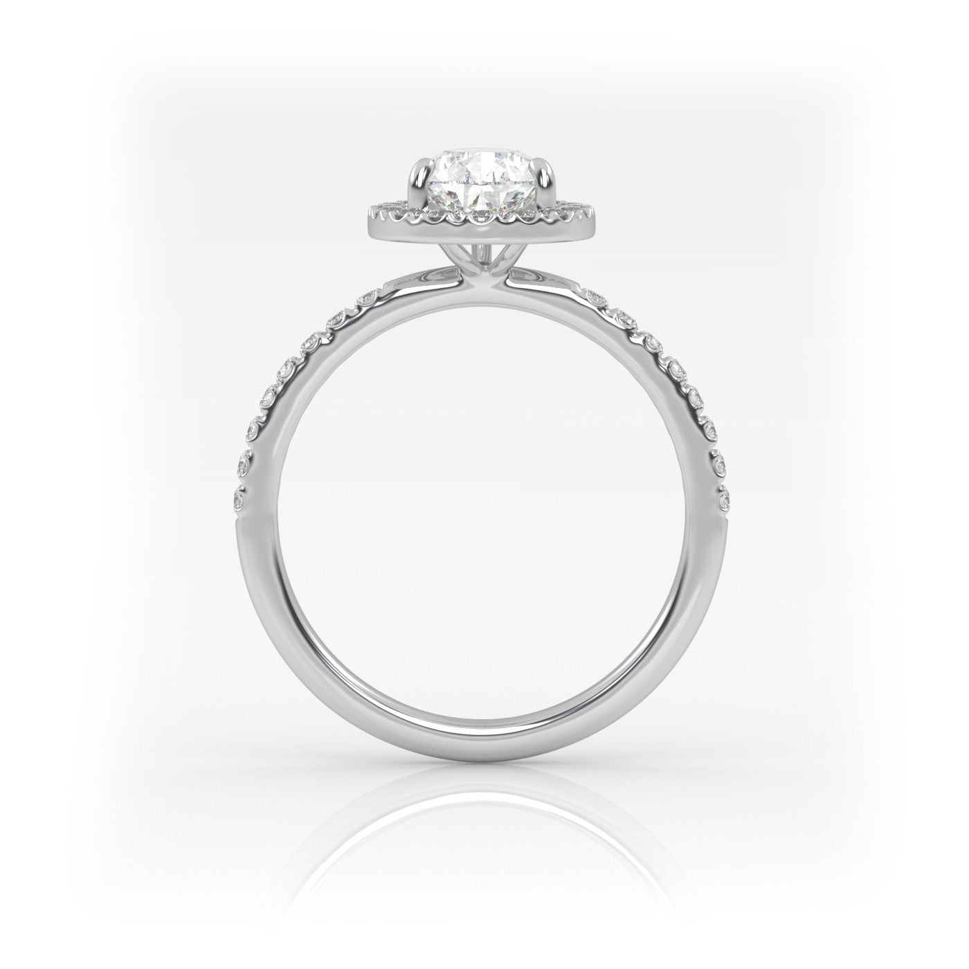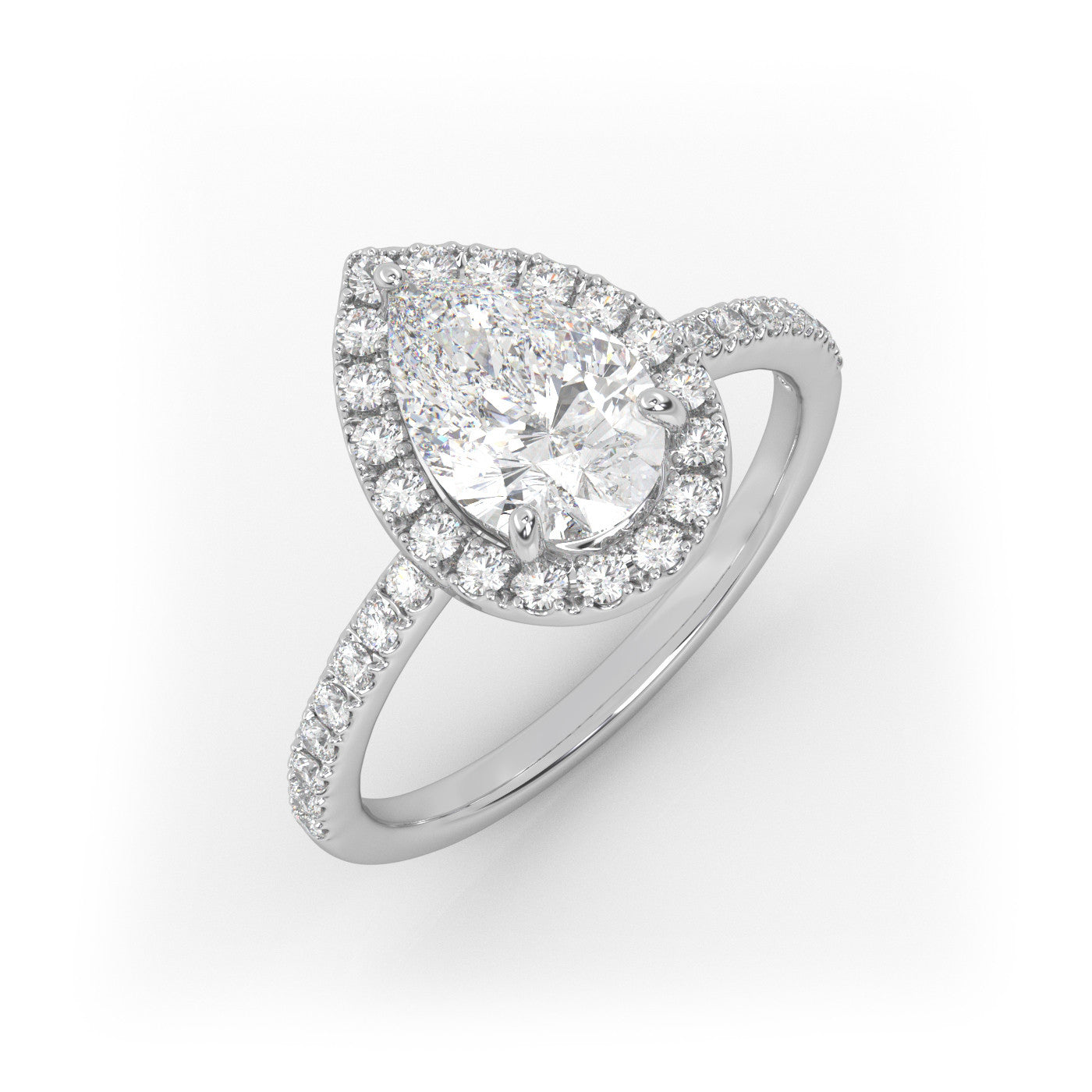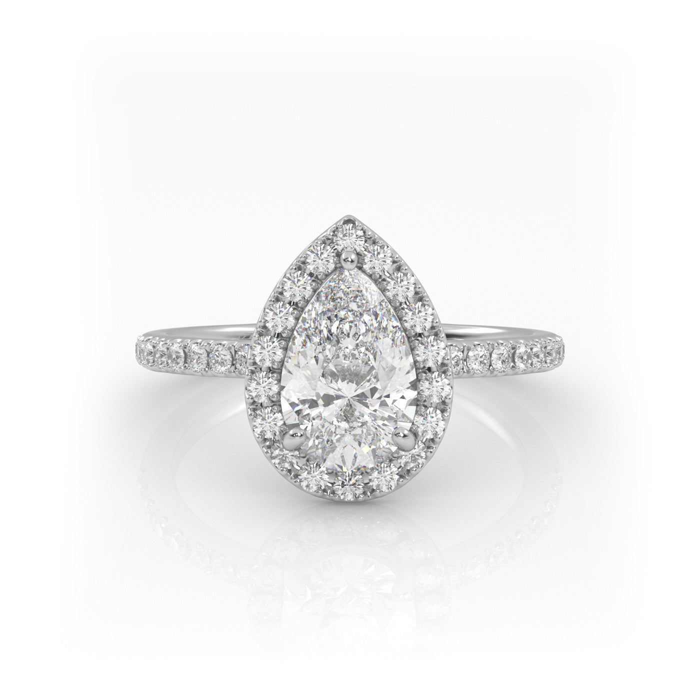 Ten elegancki pierścionek halo wykonany z 18-karatowego białego złota prezentuje centralnie umieszczony diament o szlifie gruszkowym, otoczony przez halo drobnych diamentów, które dodatkowo podkreślają jego blask. Obrączka pavé, zdobiona drobnymi diamentami, zapewnia dodatkowy połysk, czyniąc całość spektakularnie lśniącą. Chłodne odcienie białego złota idealnie komplementują przejrzystość diamentów, tworząc wyrafinowaną, nowoczesną biżuterię idealną na zaręczyny lub jako luksusowy prezent.