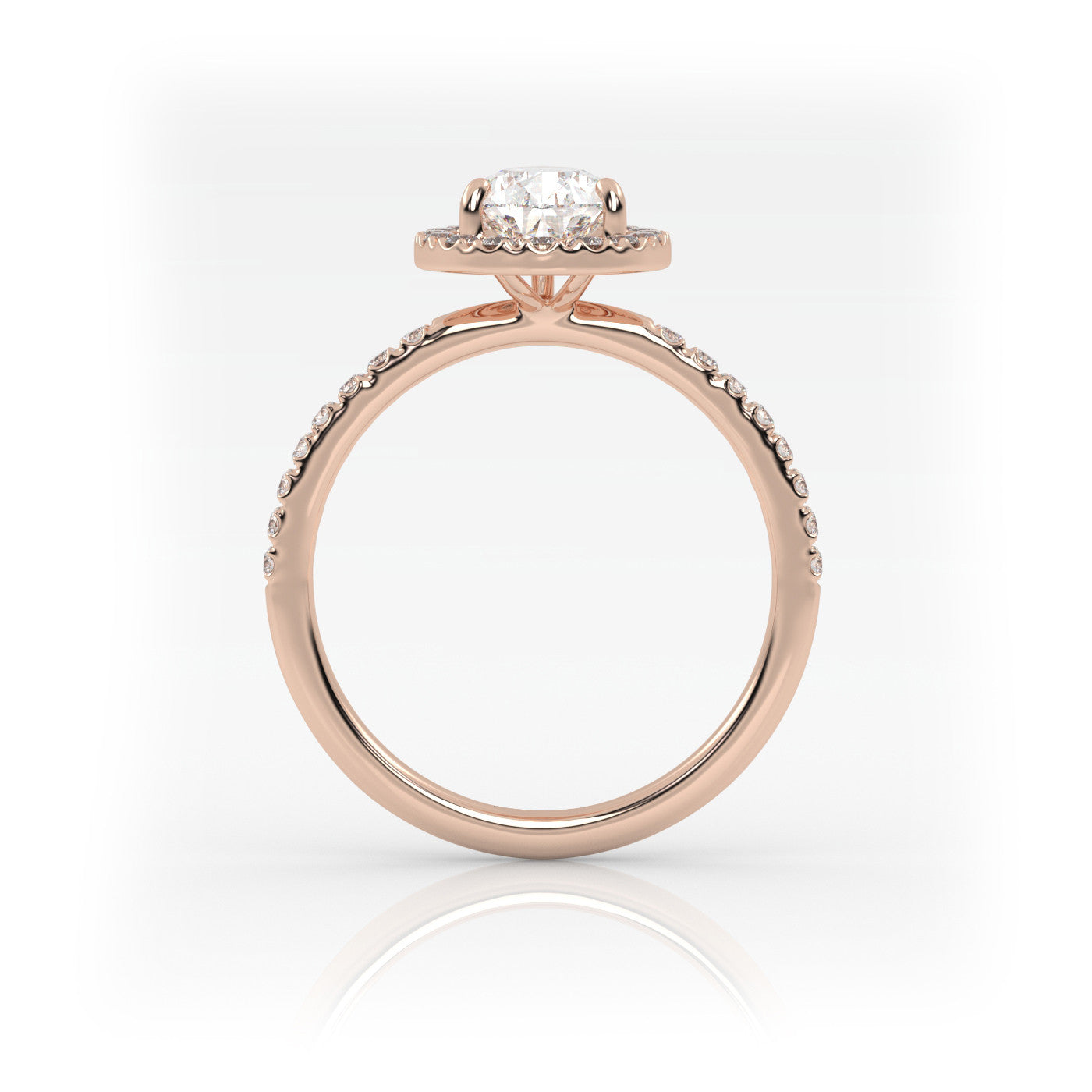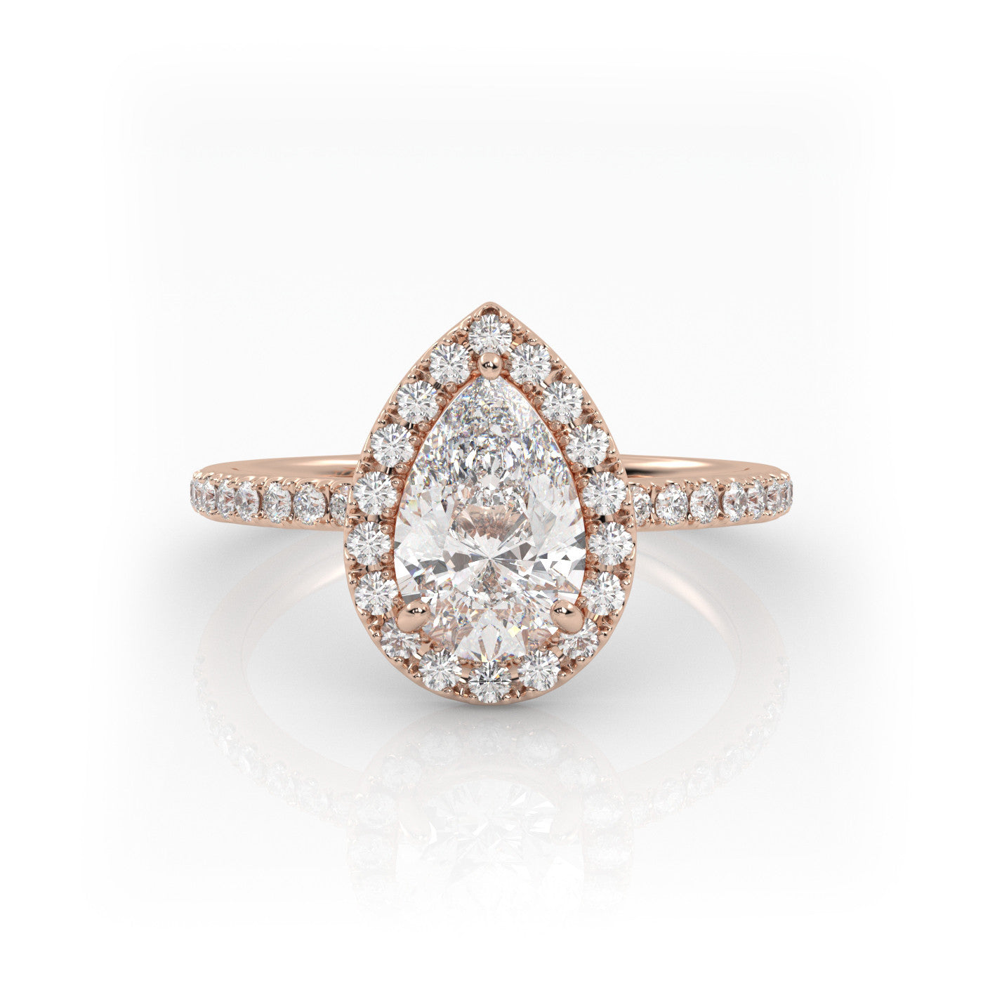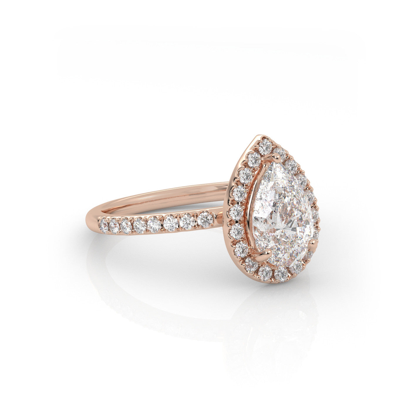 Ten zachwycający pierścionek halo, wykonany z 18-karatowego różowego złota, prezentuje centralnie umieszczony diament o szlifie gruszkowym, który jest elegancko otoczony przez halo drobnych diamentów, dodając głębi i blasku centralnemu kamieniowi. Obrączka pavé, bogato inkrustowana drobnymi diamentami, rozświetla całą konstrukcję, oferując olśniewającą estetykę. Różowe złoto dodaje delikatnego, romantycznego charakteru, czyniąc ten pierścionek idealnym wyborem na zaręczyny, który łączy nowoczesność z klasycznym pięknem.