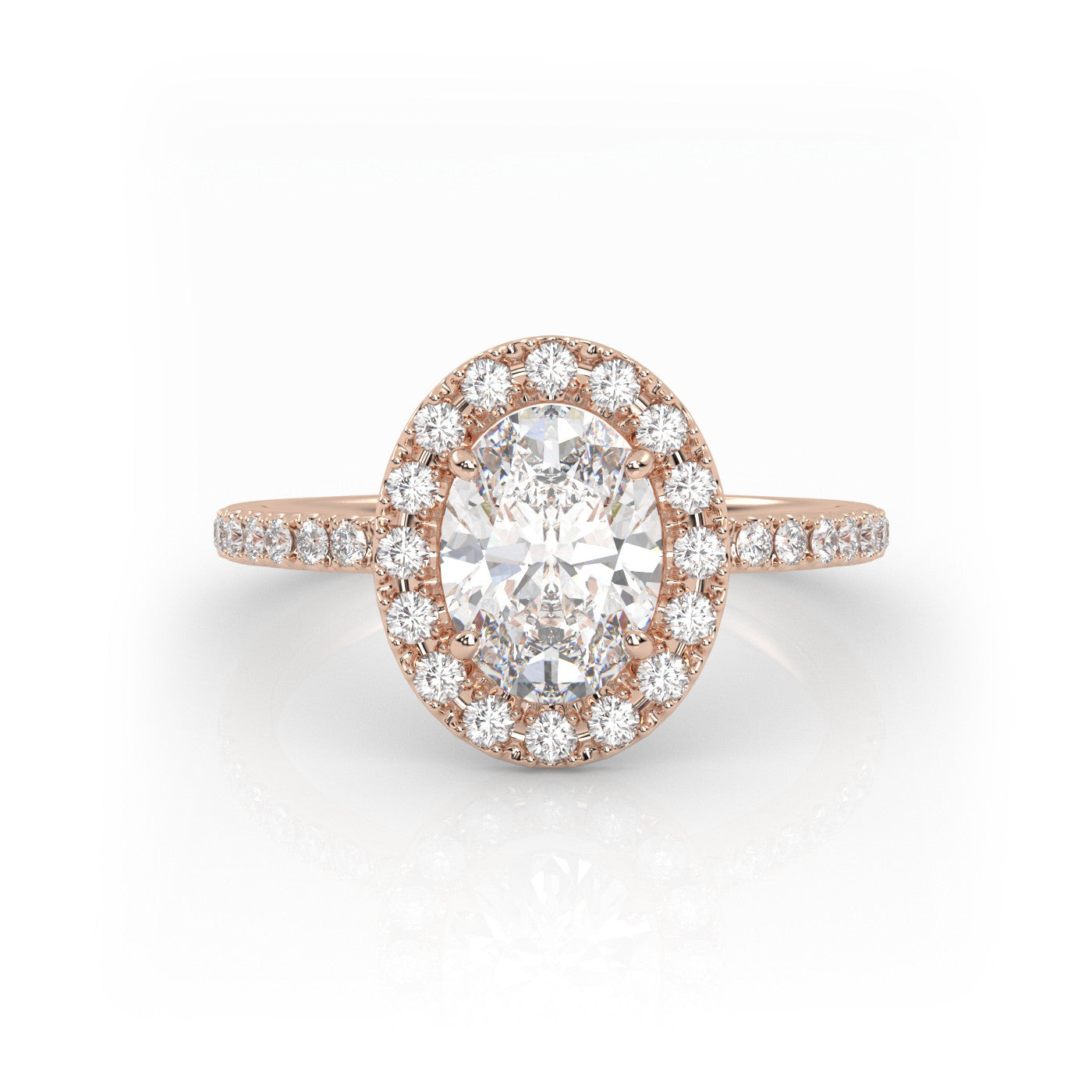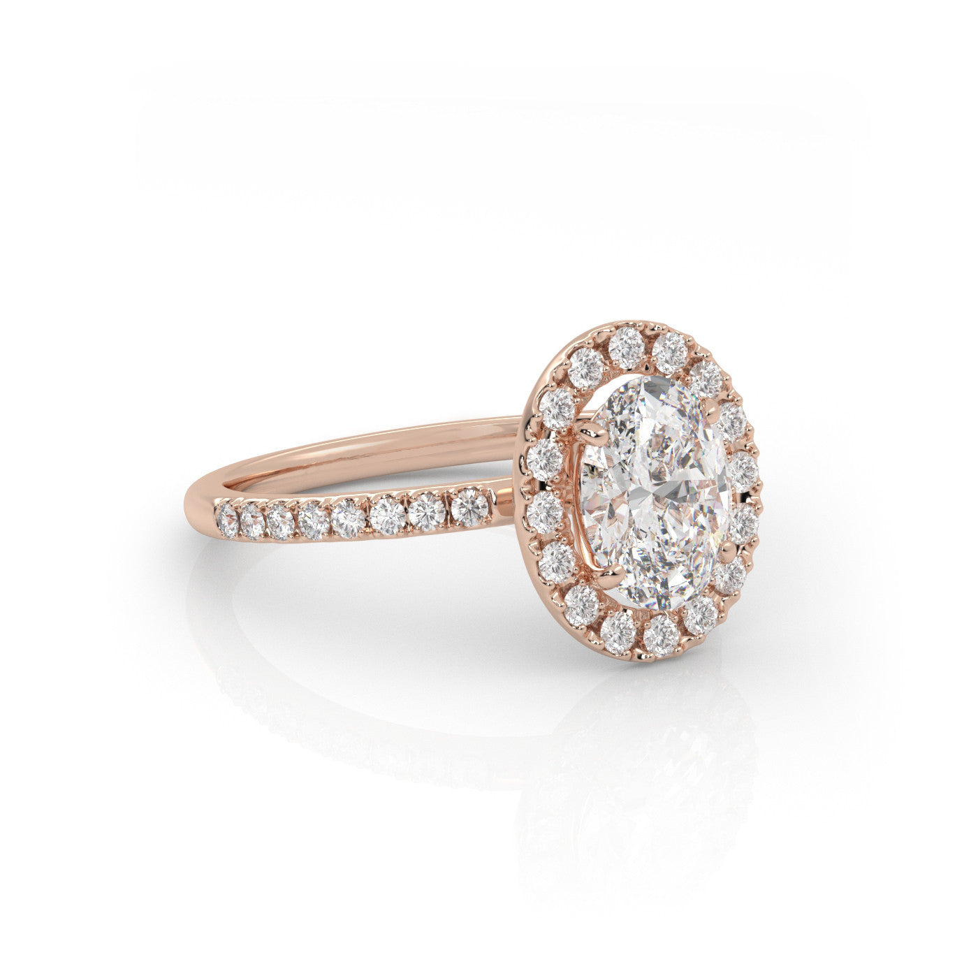 Ten urokliwy pierścionek halo, wykonany z 18-karatowego różowego złota, prezentuje centralnie umieszczony diament o szlifie owalnym, który jest otoczony przez delikatny halo z drobnych diamentów pavé. Obrączka pavé, równie bogato inkrustowana diamentami, dodaje dodatkowego blasku, elegancko akcentując główny kamień. Ciepłe tony różowego złota dodają biżuterii romantycznego uroku, tworząc idealną propozycję dla osób szukających pierścionka zaręczynowego, który łączy subtelność z nowoczesnym designem.