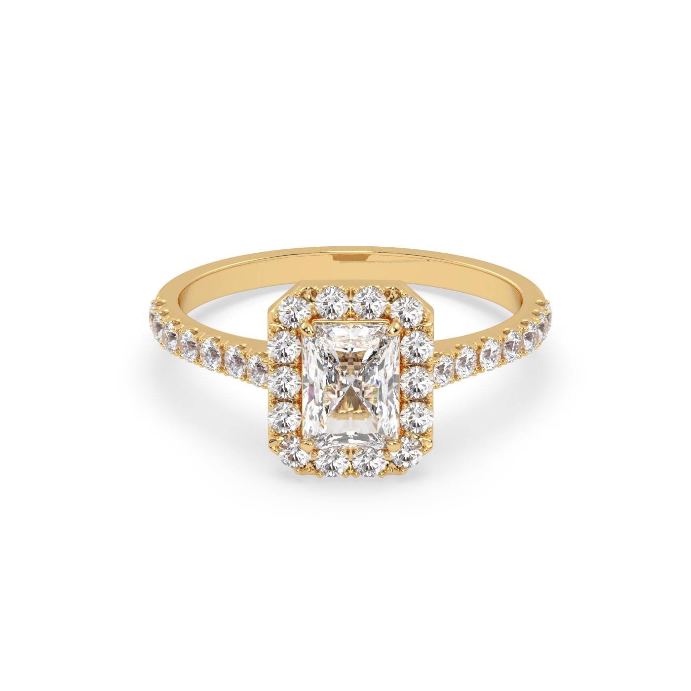 Ten ekskluzywny pierścionek z 18-karatowego żółtego złota prezentuje diament o szlifie radiant, otoczony przez halo drobnych diamentów, które dodatkowo podkreślają jego blask. Obrączka pavé, inkrustowana drobnymi diamentami, dodaje dodatkowego blasku i luksusu, tworząc olśniewający efekt świetlny. Ciepłe tony żółtego złota wspaniale harmonizują z jasnością diamentów, oferując wyjątkową elegancję i nowoczesność. Idealny jako pierścionek zaręczynowy, który łączy tradycyjną estetykę z nowoczesnymi rozwiązaniami designu, jest doskonałym wyborem dla osób poszukujących niezapomnianego symbolu swojej miłości.