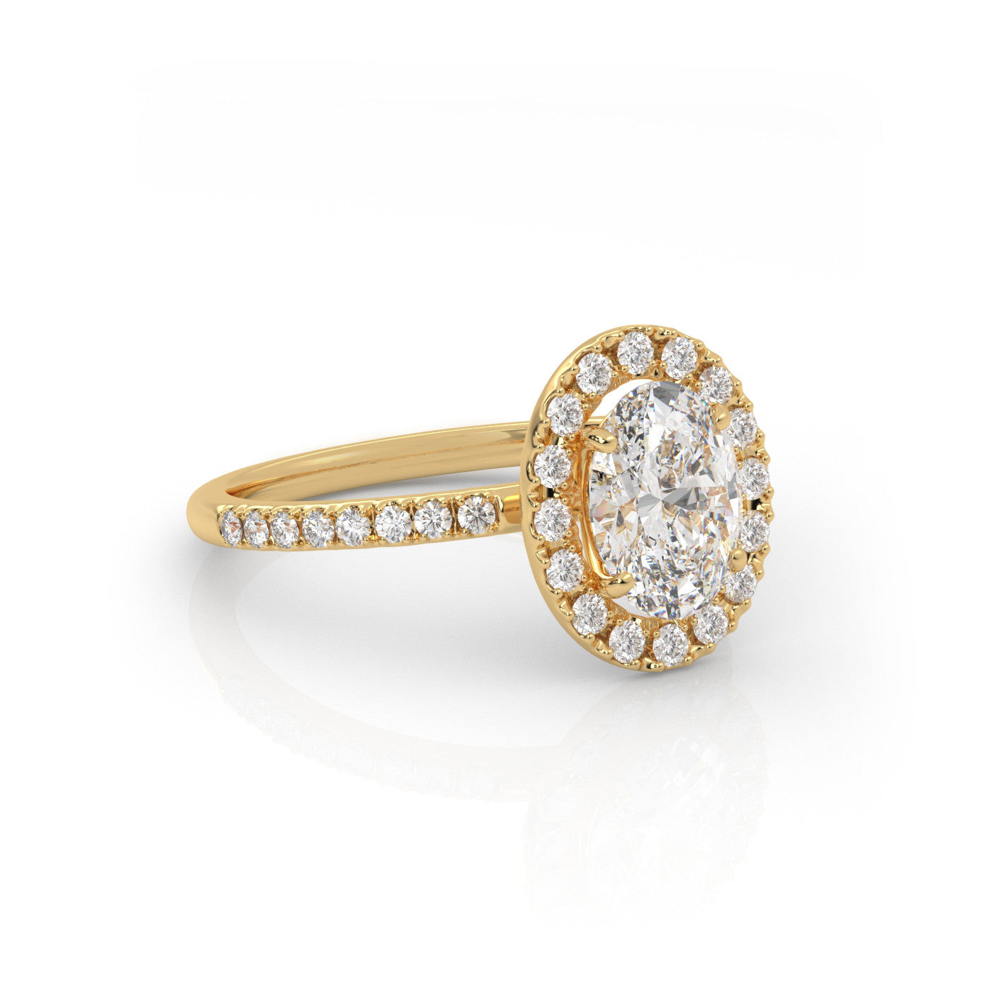 Ten zachwycający pierścionek halo, wykonany z 18-karatowego żółtego złota, prezentuje centralnie umieszczony diament o szlifie owalnym, otoczony przez delikatne diamenty tworzące efekt halo. Obrączka pavé, inkrustowana drobnymi diamentami, dodaje dodatkowego blasku, elegancko podkreślając główny kamień. Ciepłe tony żółtego złota w połączeniu z jasnymi diamentami tworzą unikalny, luksusowy wygląd, który jest zarówno klasyczny, jak i nowoczesny. Idealny dla osób, które szukają pierścionka zaręczynowego o wyjątkowej prezencji i niezapomnianym charakterze.