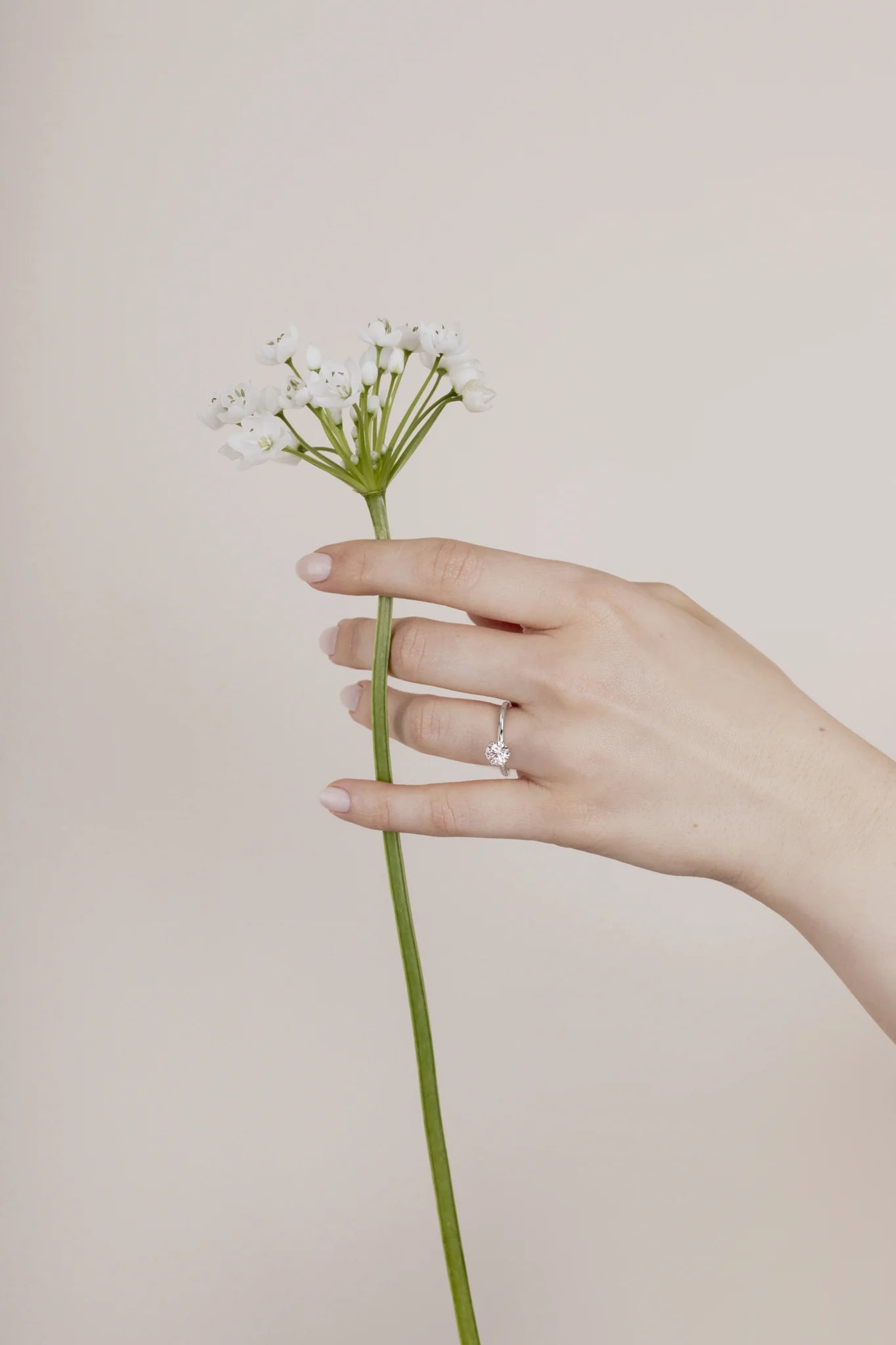 Ten wyrafinowany pierścionek solitarny z białego złota 18k charakteryzuje się okrągłym diamentem laboratoryjnym umieszczonym w bezpiecznej sześciopazurkowej oprawie, która nie tylko chroni diament, ale także eksponuje jego naturalny blask przez maksymalne przepuszczenie światła. Chłodne tony białego złota doskonale komplementują jasność diamentu, tworząc efektowny kontrast i dodając pierścionkowi nowoczesnego charakteru. Idealny dla osób poszukujących elegancji i bezpieczeństwa, ten pierścionek to wybór doskonały na zaręczyny lub jako symbol trwałej miłości.