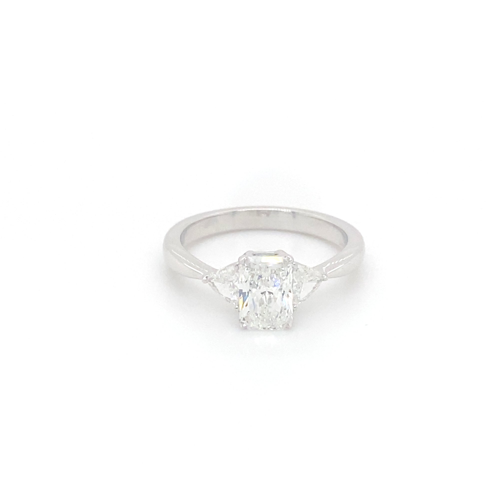 Pierścionek z Białego Złota 18k z Centralnym Diamentem Radiant i Dwoma Bocznymi Diamentami w Kształcie Trójkąta