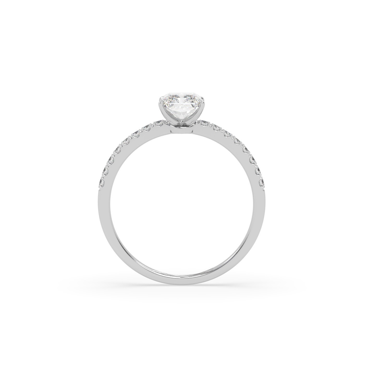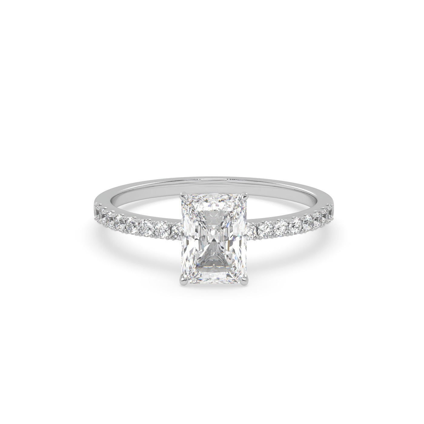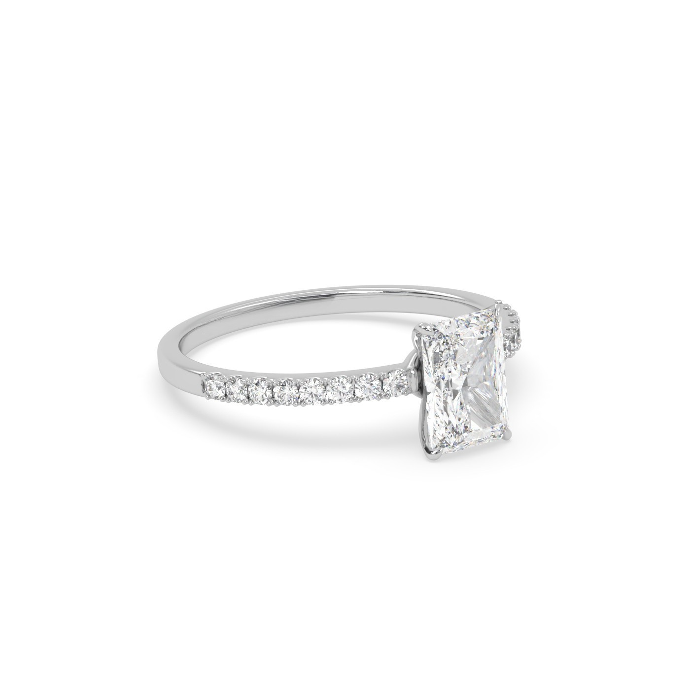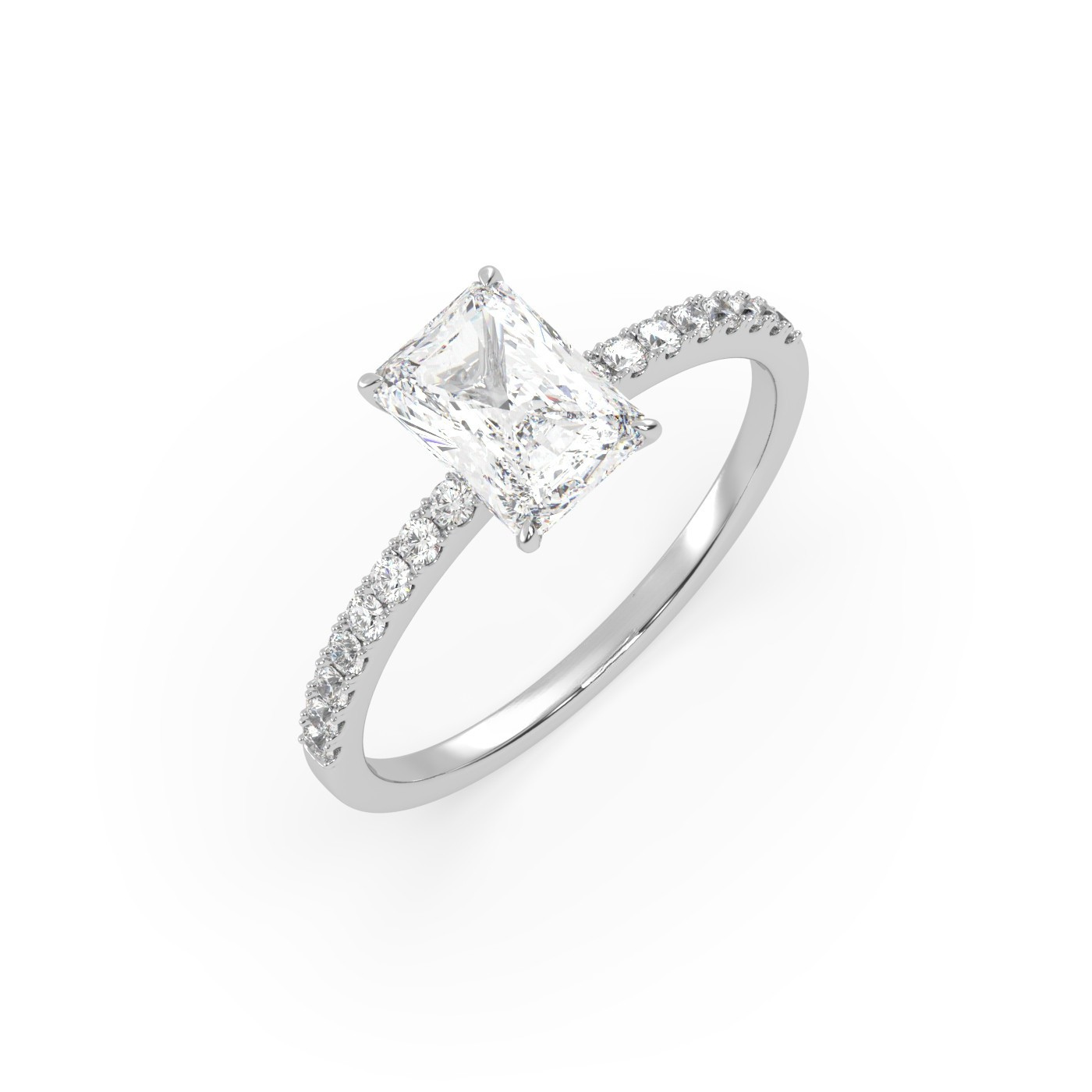 Ten elegancki pierścionek z 18-karatowego białego złota prezentuje centralny diament o szlifie radiant, znany z intensywnego blasku i nowoczesnego charakteru. Obrączka pavé, wysadzana drobnymi diamentami, dodaje całości luksusowego wykończenia i subtelnej elegancji. Chłodne tony białego złota idealnie komponują się z blaskiem kamieni, tworząc wyrafinowaną biżuterię na każdą okazję — szczególnie zaręczyny.