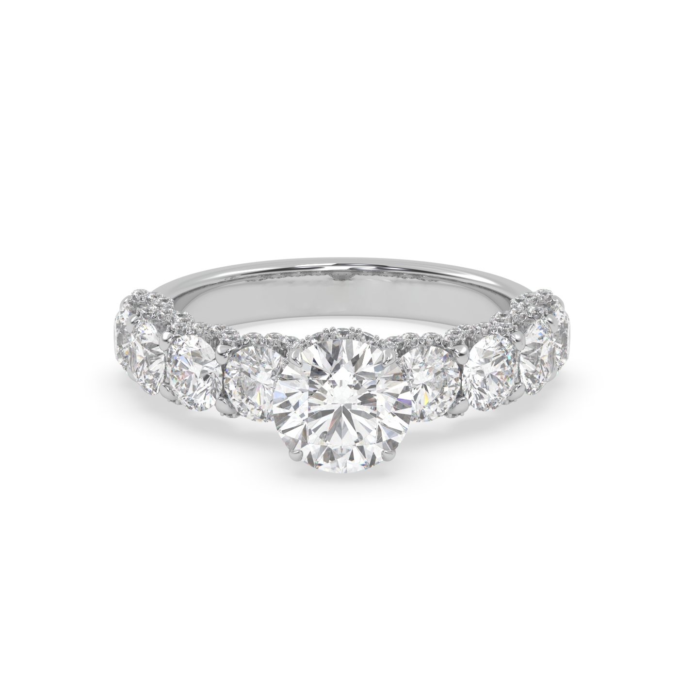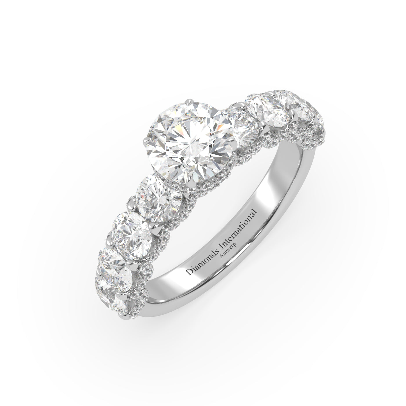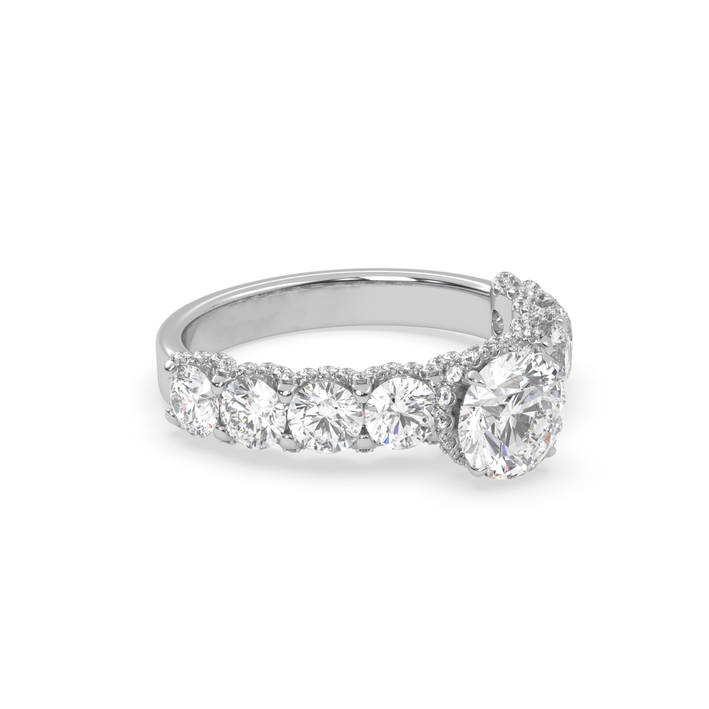 Olśniewający pierścionek wykonany z 18-karatowego białego złota, z centralnym laboratoryjnym diamentem o szlifie okrągłym. Po bokach znajdują się dwa większe diamenty, które wzmacniają efekt blasku i tworzą elegancką kompozycję. Dodatkowe diamenty osadzone pod pazurami nadają pierścionkowi luksusowego charakteru i wyjątkowej głębi wizualnej. To idealny wybór dla osób ceniących nowoczesne wzornictwo i mistrzowskie rzemiosło jubilerskie.