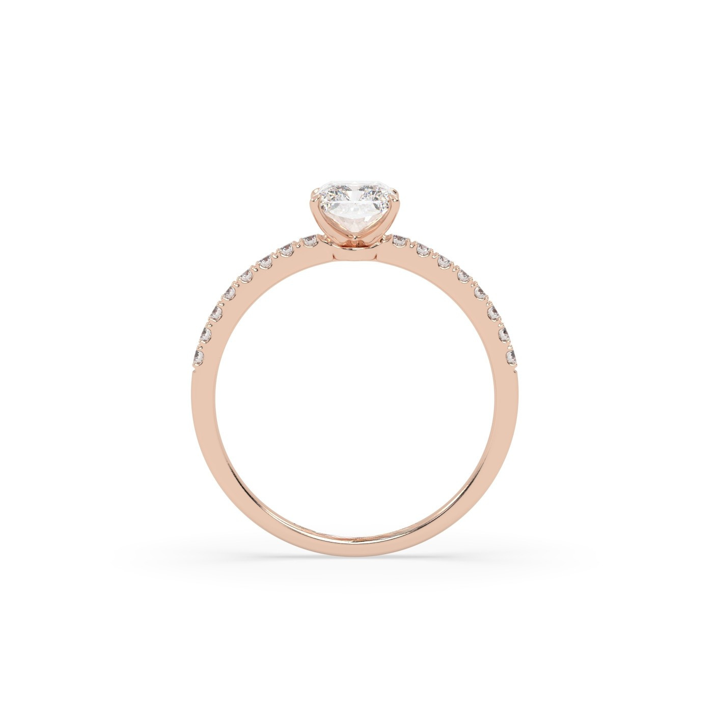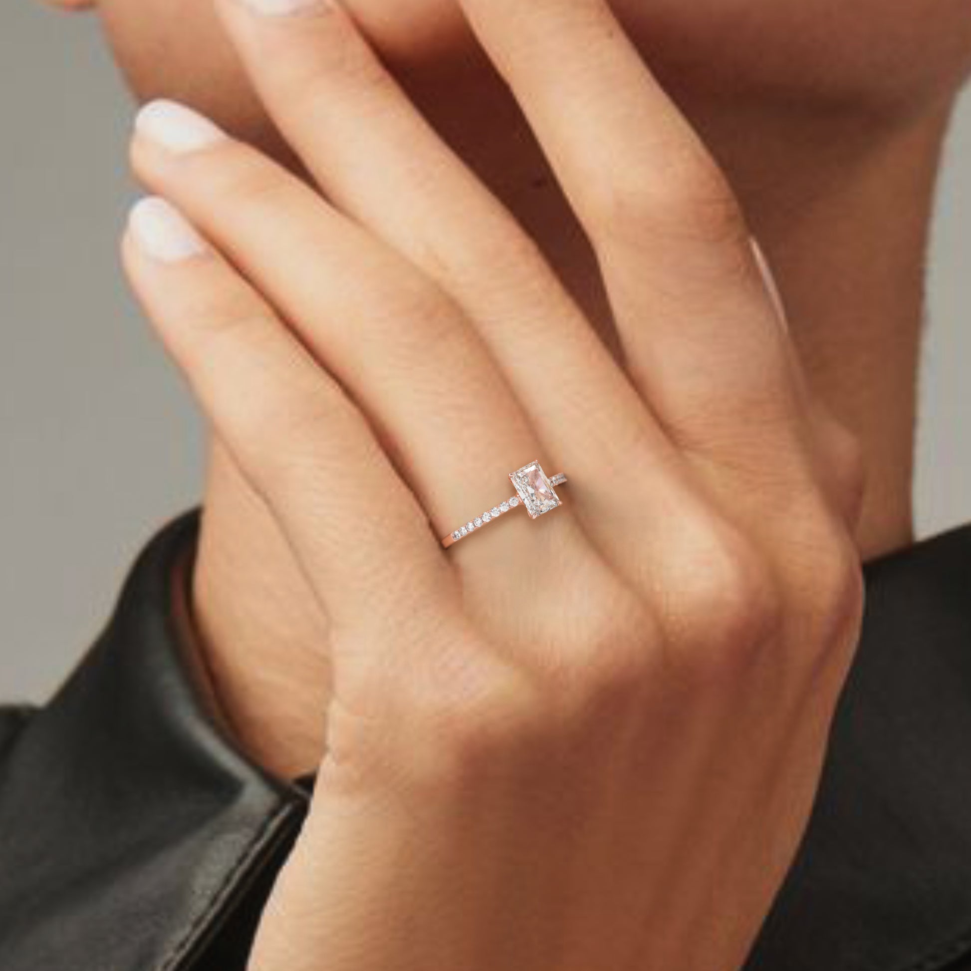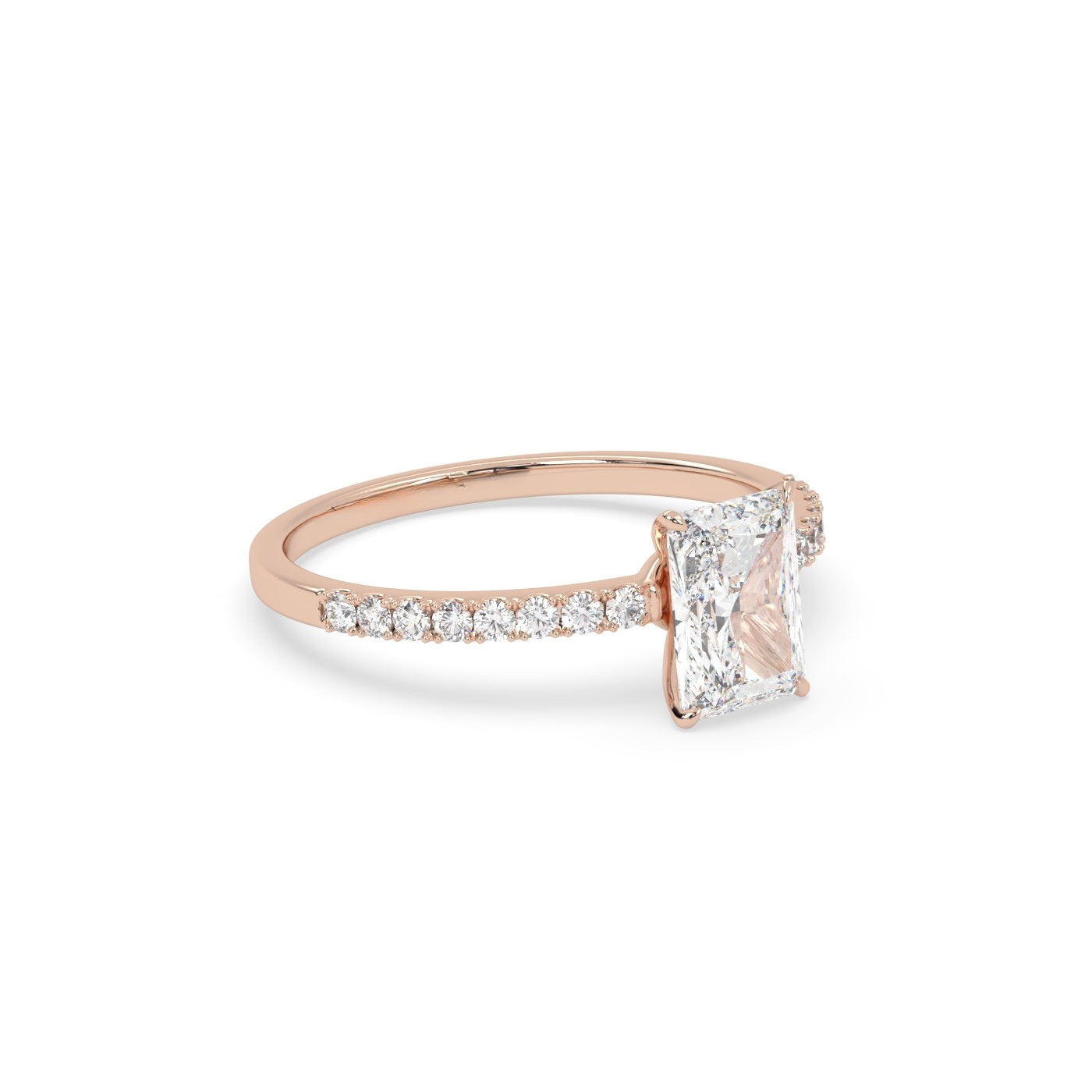 Ten olśniewający pierścionek wykonany z 18-karatowego różowego złota posiada centralny diament o szlifie radiant, który przyciąga wzrok swoim intensywnym blaskiem i geometryczną elegancją. Obrączka pavé, wysadzana drobnymi diamentami, dodaje całości romantycznego charakteru i luksusowego wykończenia. Ciepłe tony różowego złota pięknie współgrają z jasnością diamentów, tworząc pierścionek idealny na zaręczyny lub wyjątkowy prezent.