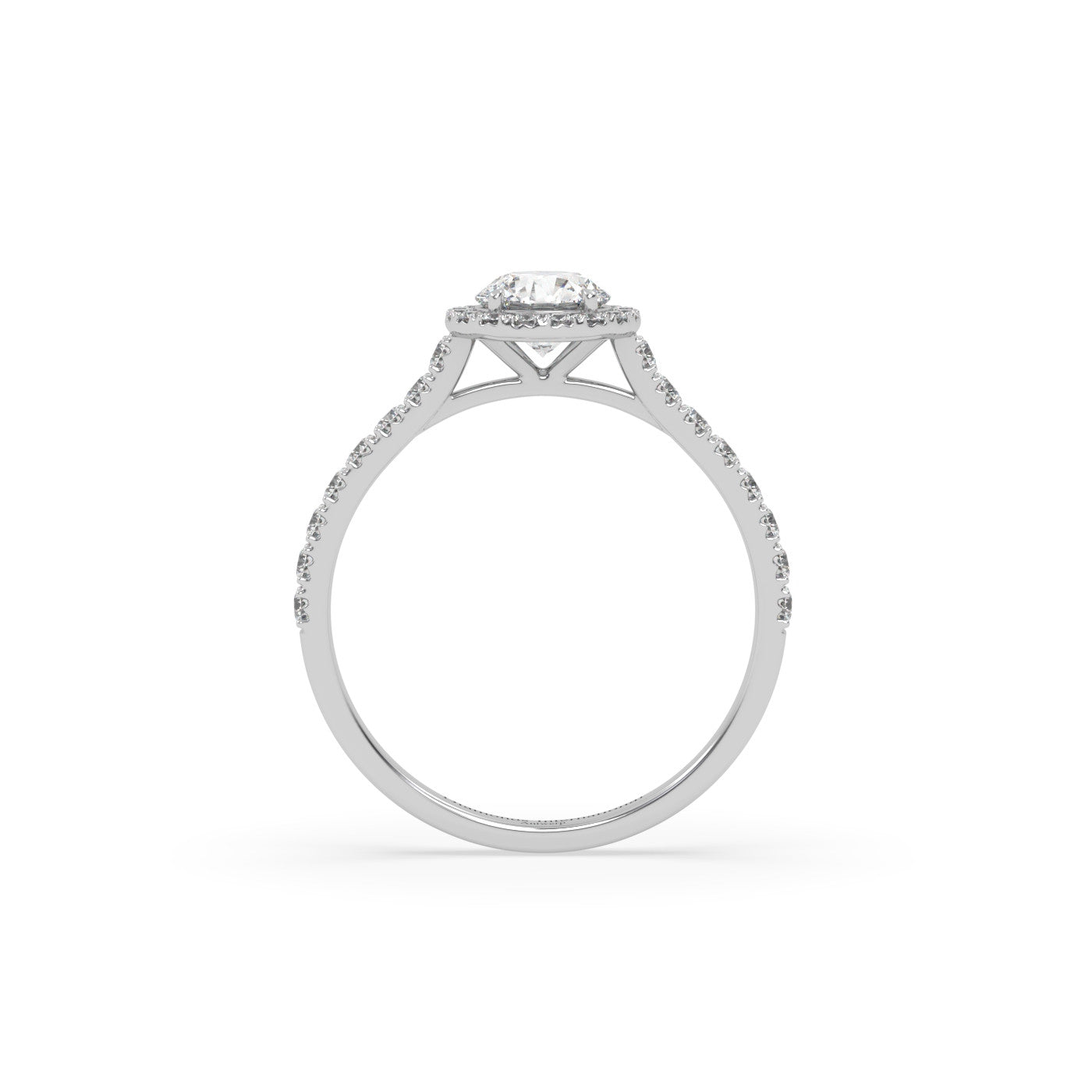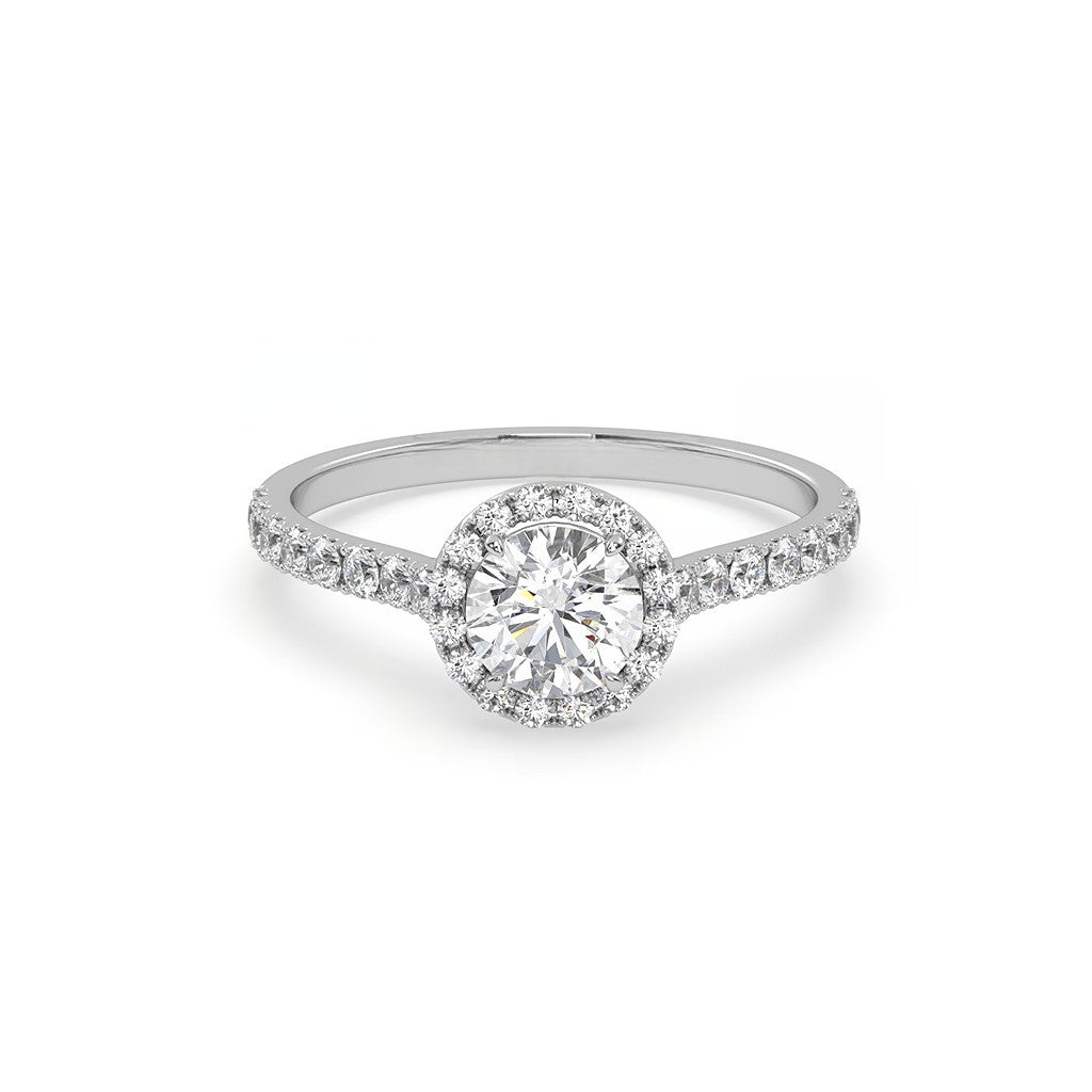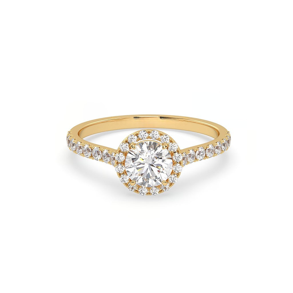 Ten wytworny pierścionek z 18-karatowego złota prezentuje centralnie umieszczony, okrągły diament w oprawie halo, co dodatkowo podkreśla jego blask i czystość. Obrączka, zdobiona drobnymi diamentami w technice pavé, dodaje pierścionkowi subtelnego splendoru i elegancji. Dzięki zastosowaniu klasycznych elementów designu w połączeniu z nowoczesnymi technikami osadzania diamentów, pierścionek ten jest idealnym wyborem na zaręczyny lub jako prezent na specjalną okazję. Jego olśniewający design sprawia, że jest to biżuteria nie tylko piękna, ale i niezapomniana.