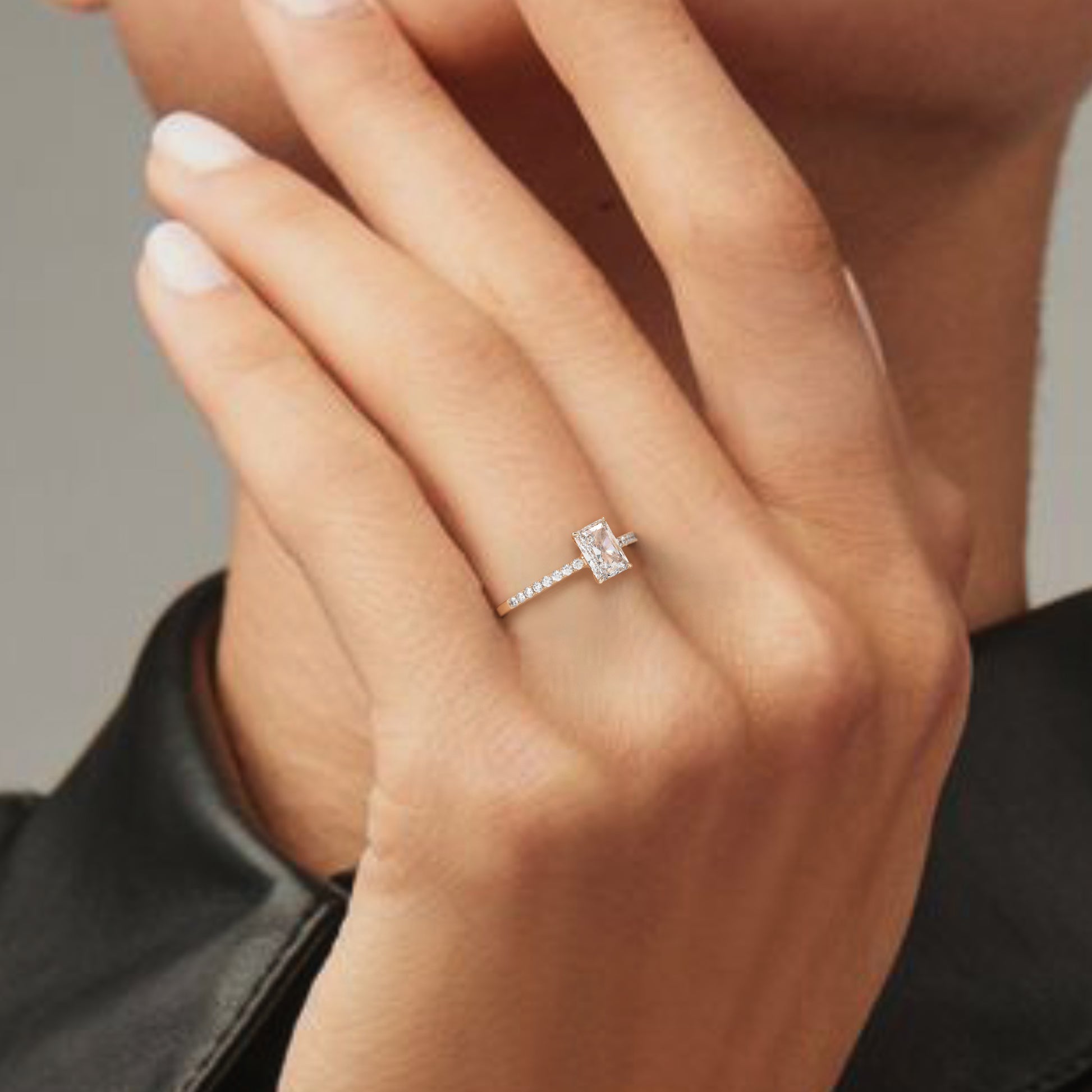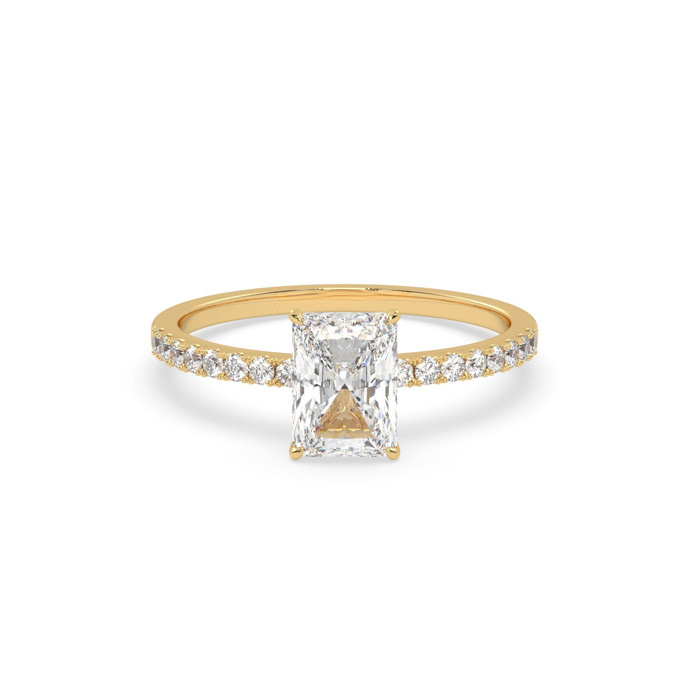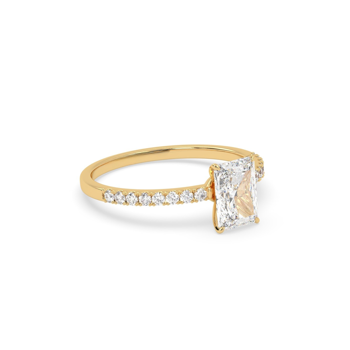 Ten wyjątkowy pierścionek z 18-karatowego żółtego złota prezentuje centralny diament o szlifie radiant, który zachwyca swoim intensywnym blaskiem i nowoczesnym kształtem. Obrączka pavé, inkrustowana drobnymi diamentami, dodaje całości wyrafinowanego charakteru i podkreśla elegancję pierścionka. Ciepłe odcienie żółtego złota doskonale komponują się z jasnością kamieni, czyniąc ten model idealnym wyborem na zaręczyny lub ważny moment w życiu.