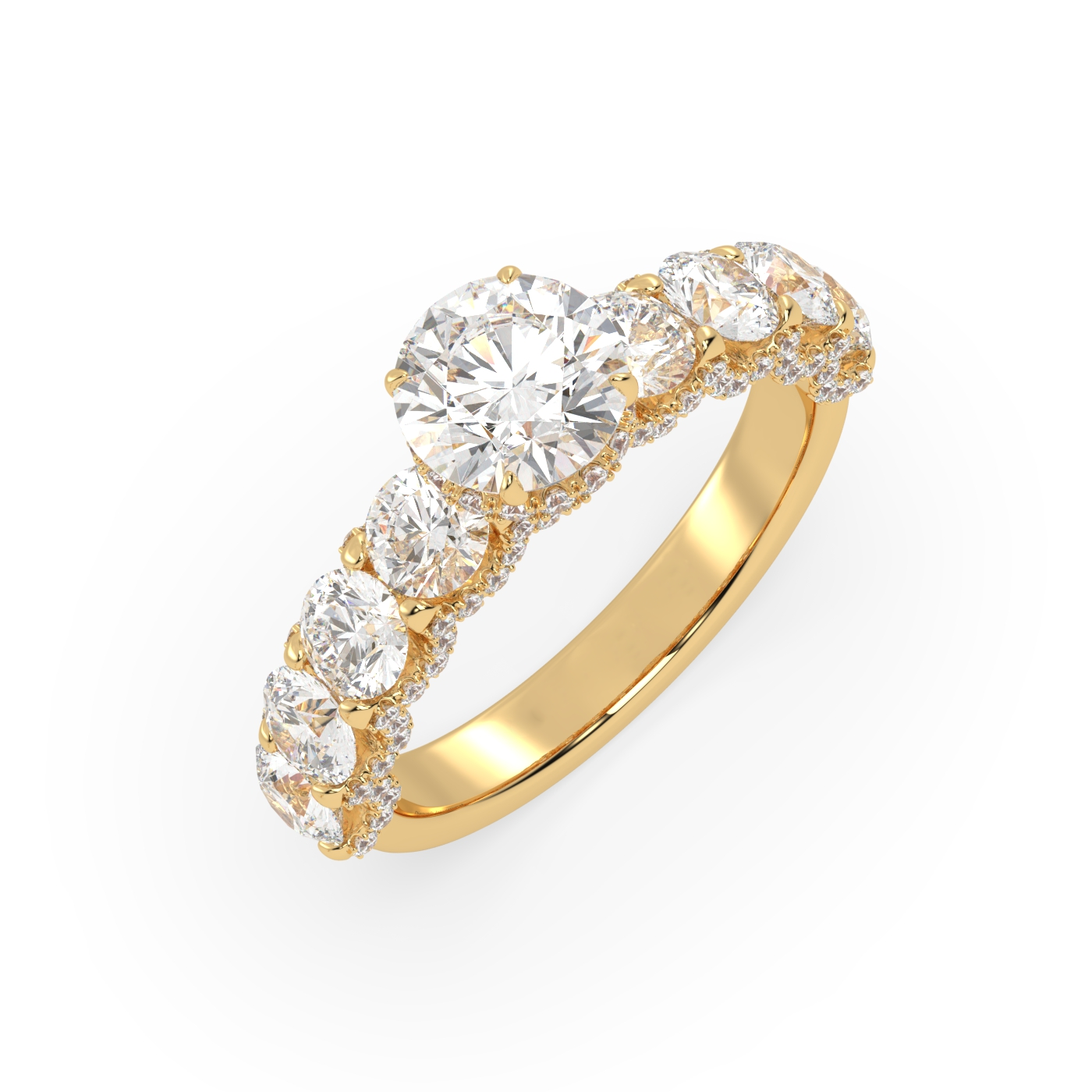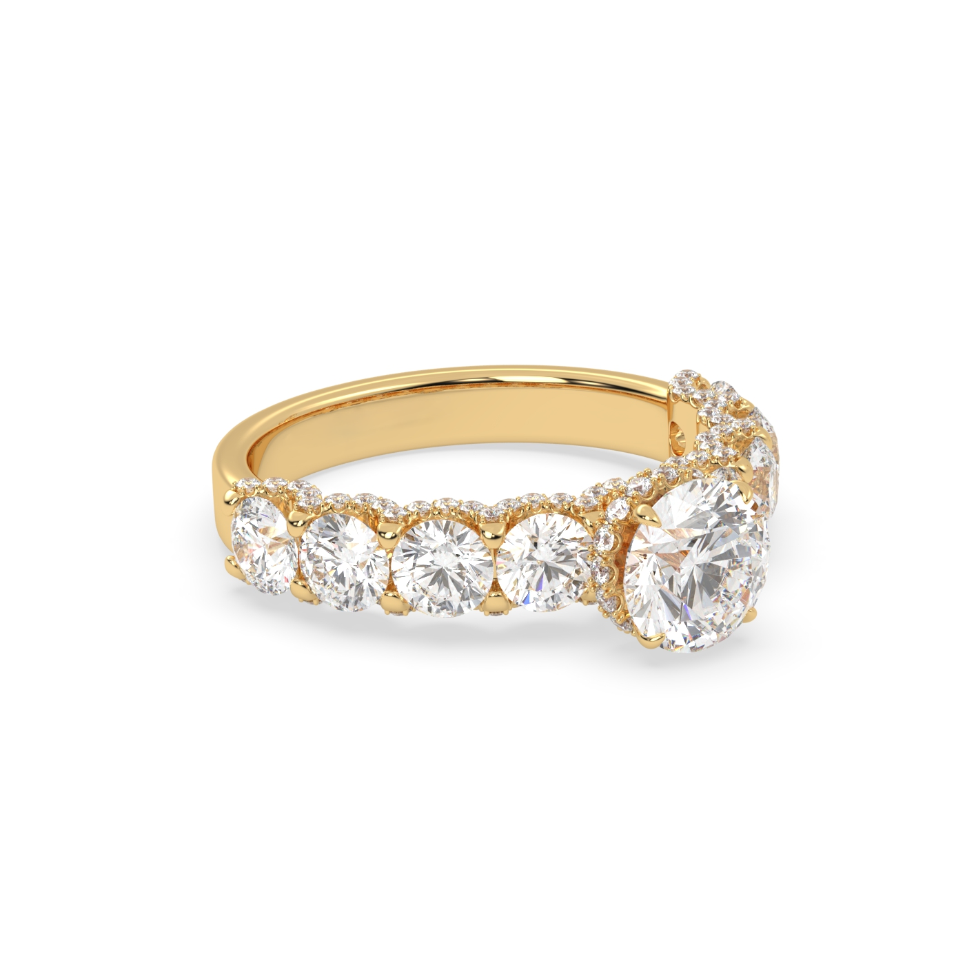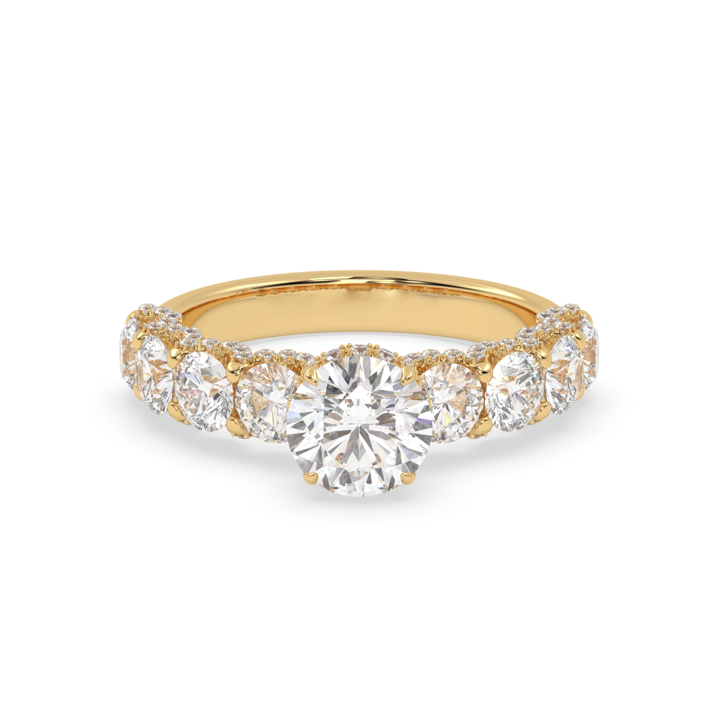 Elegancki pierścionek wykonany z 18-karatowego żółtego złota z centralnym, laboratoryjnym diamentem o szlifie okrągłym. Po obu stronach znajdują się większe boczne diamenty, które dodają mu blasku i głębi. Dodatkowe diamenty osadzone pod pazurami sprawiają, że pierścionek zachwyca każdym szczegółem — nawet z boku. Ciepły odcień żółtego złota idealnie kontrastuje z jasnością kamieni, tworząc wyjątkową kompozycję dla osób poszukujących biżuterii z charakterem.