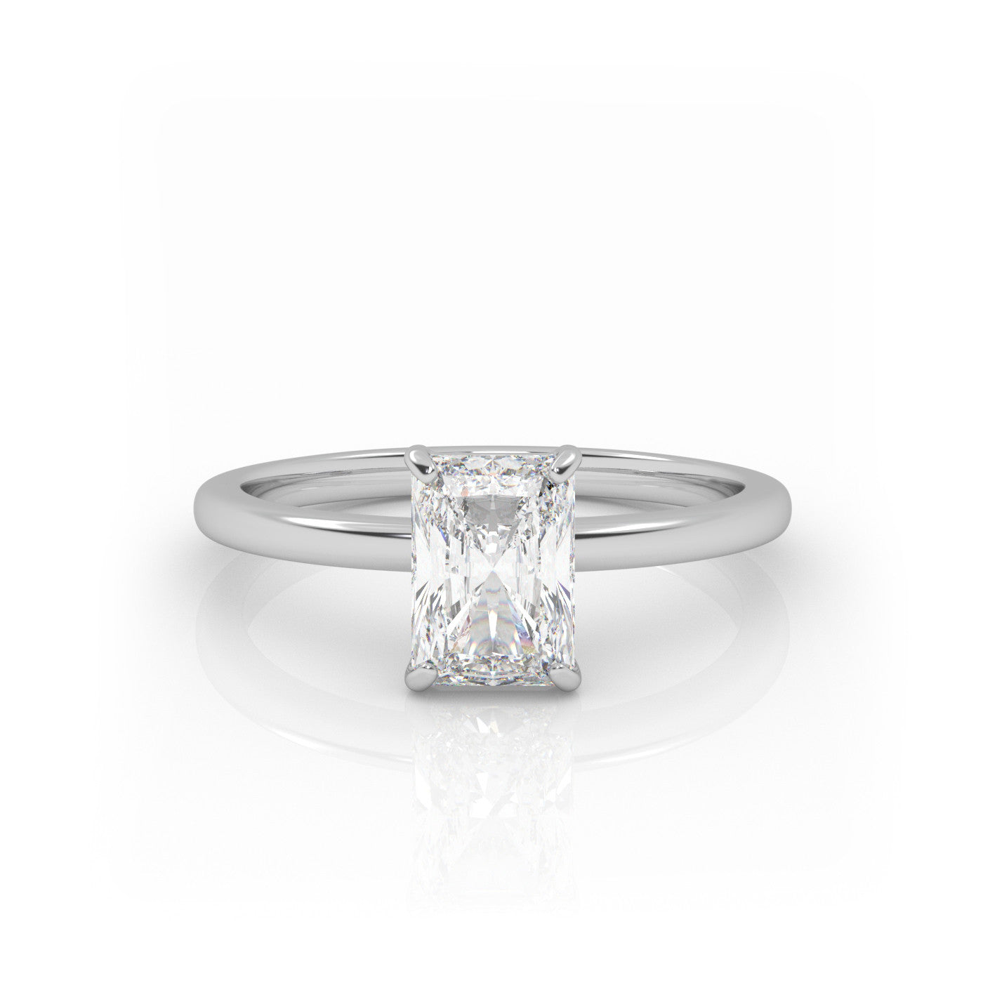 Ten elegancki pierścionek zaręczynowy wykonany z 18-karatowego białego złota cechuje się centralnie umieszczonym diamentem o szlifie radiant. Białe złoto, z jego chłodnym i nowoczesnym wyglądem, doskonale komplementuje jasność i blask diamentu, tworząc subtelną, ale wyrazistą biżuterię. Idealny dla osób poszukujących pierścionka zaręczynowego, który łączy minimalistyczny design z niezrównanym pięknem, symbolizując trwałą miłość i zobowiązanie.