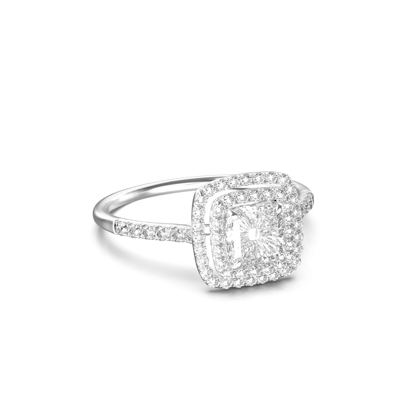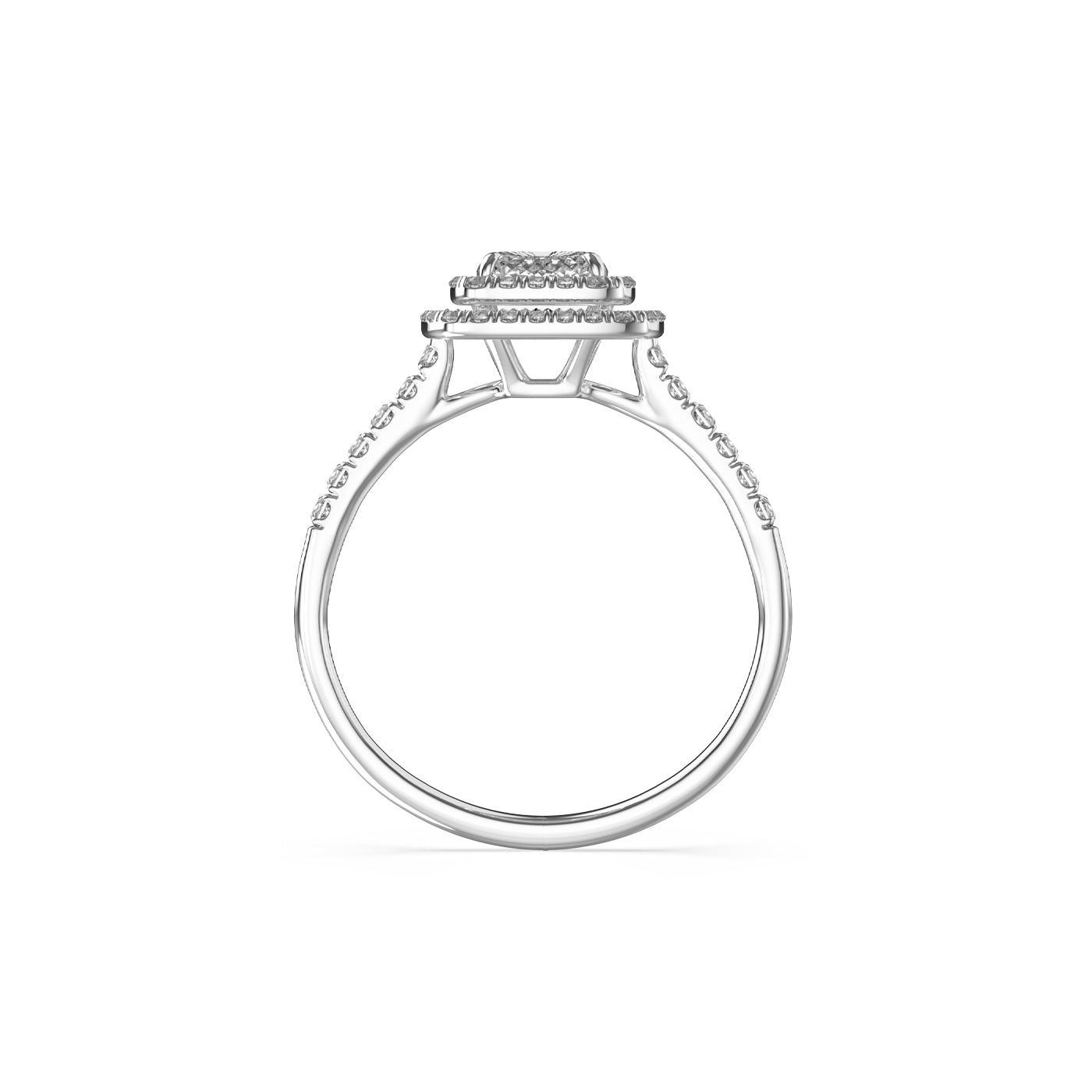 Ten oszałamiający pierścionek wykonany z 18-karatowego złota to prawdziwy symbol luksusu i elegancji. Centralny diament w kształcie okrągłym jest otoczony podwójnym halo o kształcie poduszki, które dodaje pierścionkowi głębi i blasku. Drobne diamenty osadzone w osadzie pavé pięknie podkreślają całość, tworząc efektowne otoczenie, które przyciąga wzrok. Połączenie klasycznej formy z nowoczesnym stylem sprawia, że ten pierścionek jest doskonałym wyborem na zaręczyny lub jako wyjątkowy prezent na każdą okazję. Idealny dla osób poszukujących biżuterii, która łączy w sobie tradycję z nowoczesnym designem.